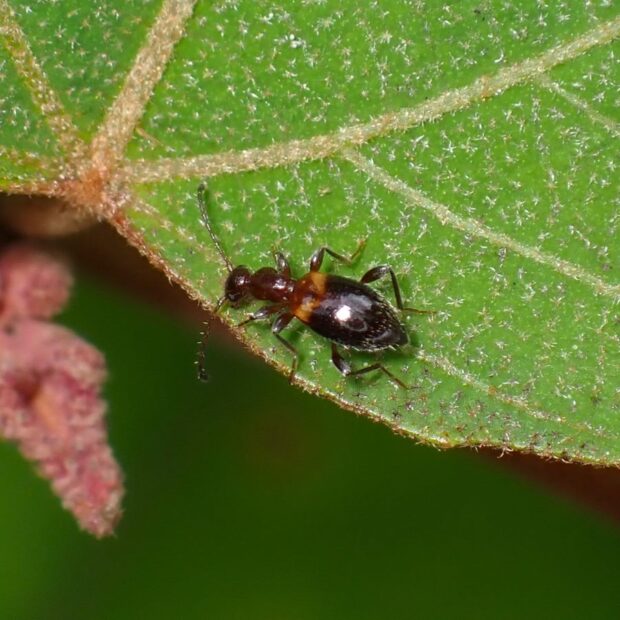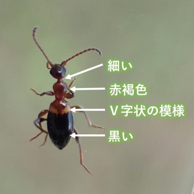 アリに擬態したアリモドキ科の仲間。 上翅(じょうし)は黒色で光沢があり、 基部に橙色のV字状の模様があります。 頭や胸は赤褐色です。 樹木の葉の上を活発に歩き回ります。
