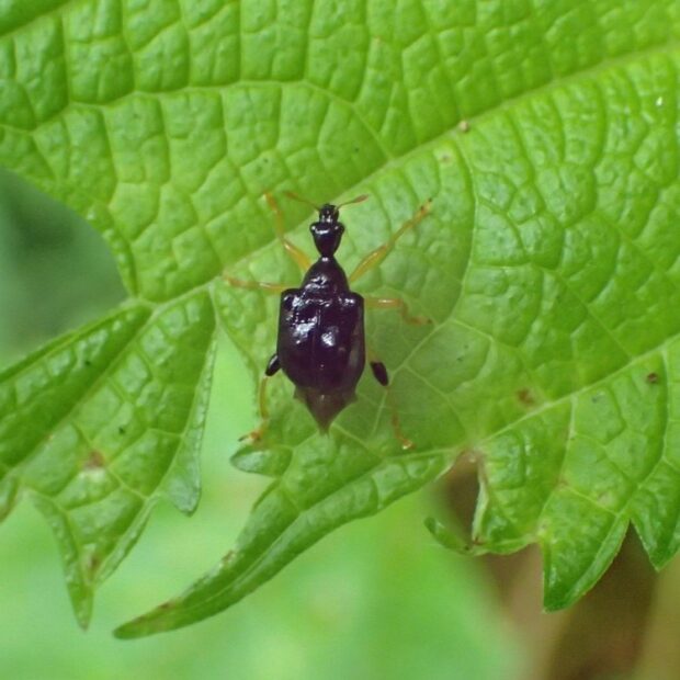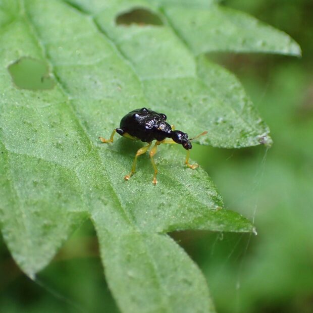 山で見られるオトシブミ科の仲間。 体色は光沢のある黒色、 触角とあしは黄色です。 上翅にコブがあり、 後あし腿節の一部が黒くなっているのが特徴。 メスはコアカソなどの葉を巻き揺籃を作り、 その中に卵を産みます。