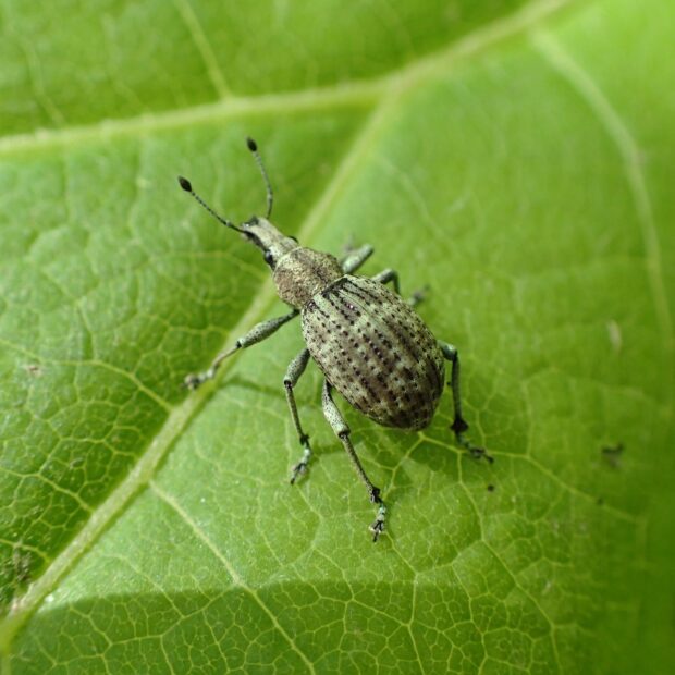 口吻があまり長くない灰色のゾウムシ。 メスのみで単為生殖を行うものと、 オスとメスが交尾をして両性生殖をするものが知られています。