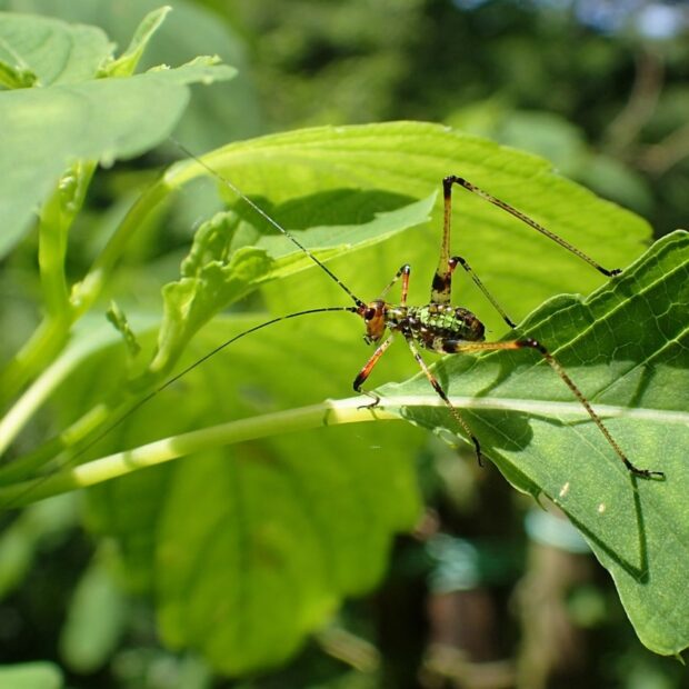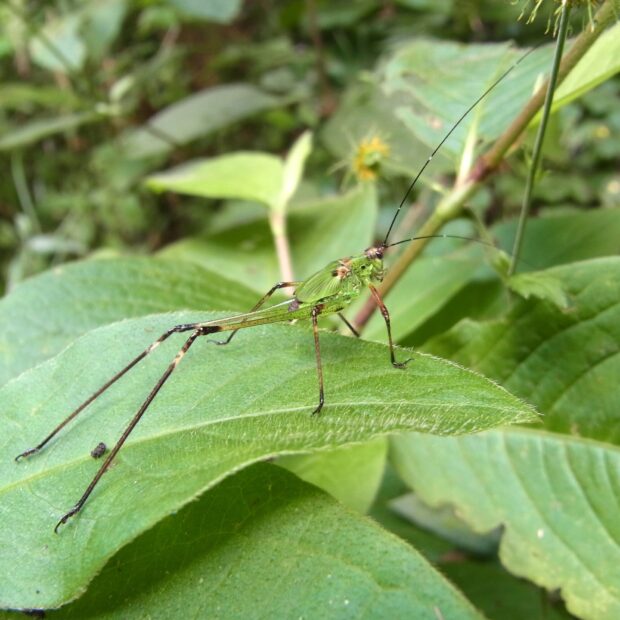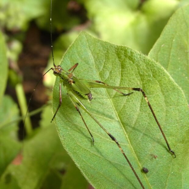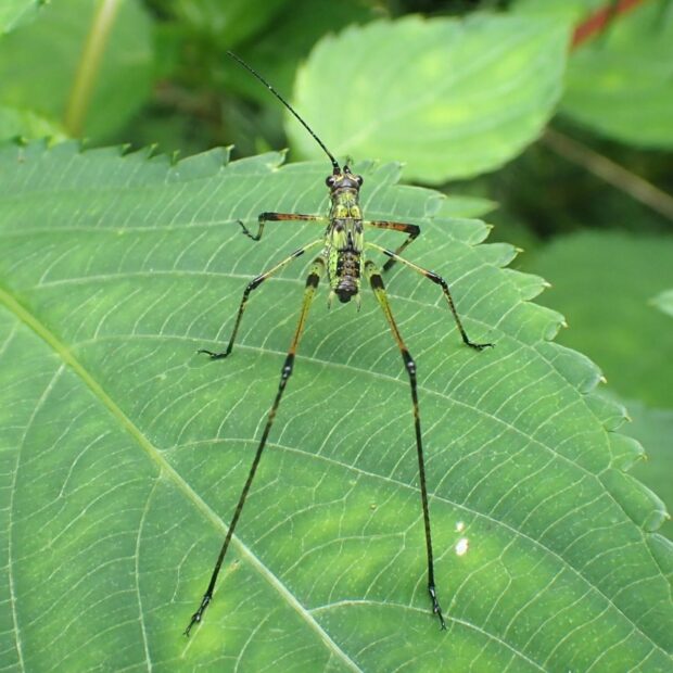 後あしが長く脛節(けいせつ=スネの部分)が黒っぽいキリギリス科の仲間。 林縁の樹上や下草で見られ、 よく飛び移動します。 若齢幼虫は、 緑、 橙、 黒などが混じり合ったまだら模様。 「ジキーッ・ジキーッ」と小さな声で鳴きます。