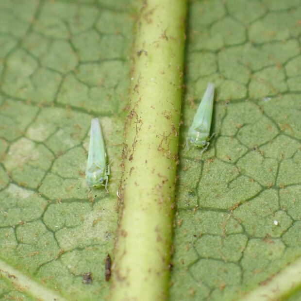ヒメヨコバイの仲間。 中央アジア原産の外来種。 日本では沖縄県でのみ確認されていましたが、 2019年に和歌山県で確認されて以降、 急速に拡大しています。 モモヒメヨコバイが葉の汁を吸うと、 葉が白くなり、 落葉することがあります。