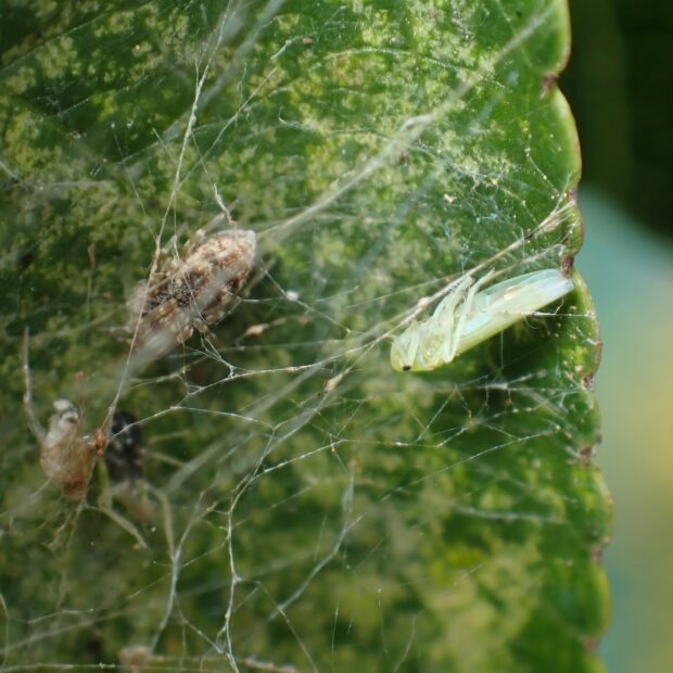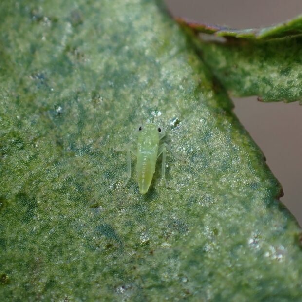 ヒメヨコバイの仲間。 中央アジア原産の外来種。 日本では沖縄県でのみ確認されていましたが、 2019年に和歌山県で確認されて以降、 急速に拡大しています。 モモヒメヨコバイが葉の汁を吸うと、 葉が白くなり、 落葉することがあります。