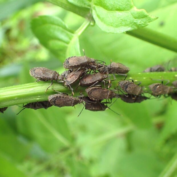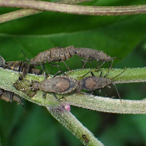 ヘリカメムシ科の仲間。 光沢のない黒褐色で、 短い毛におおわれています。 草はらで見られ、 いろいろな植物の茎に群がっています。 触角の先端が黄色いことが名前の由来。 オオツマキヘリカメムシに似ていますが、 本種はやや小さく、 生殖節の先端の形で識別できます。