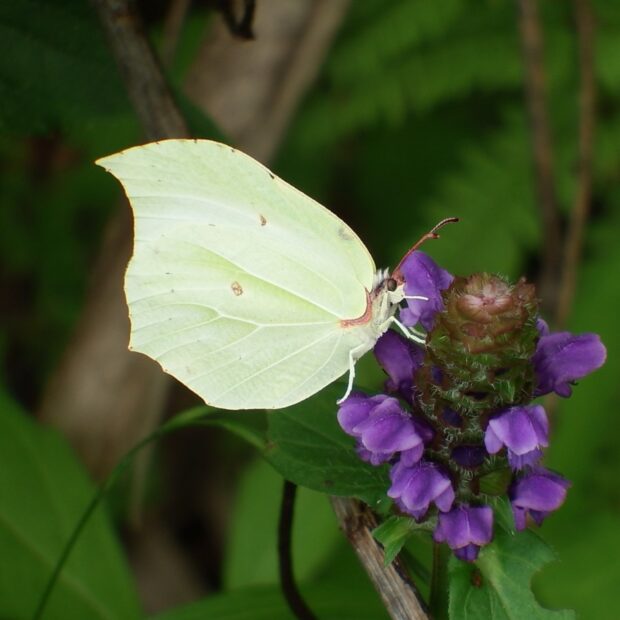 シロチョウ科の仲間。 丘陵地~山地の林縁などで見られます。 オスの前ばねの表面は黄色で、 メスはクリーム色。 6~7月に発生し、 しばらく活動した後夏眠します。 秋に再び活動後、 成虫で冬を越す長生きのチョウです。