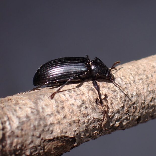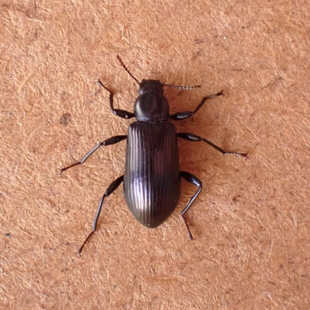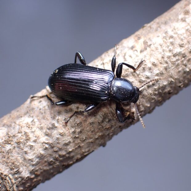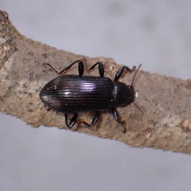 ゴミムシダマシ科ルリゴミムシダマシの仲間。 黒色で、 赤紫色~青緑色がかった光沢があります。 夜、 雑木林や照葉樹林の朽ち木などで見られます。