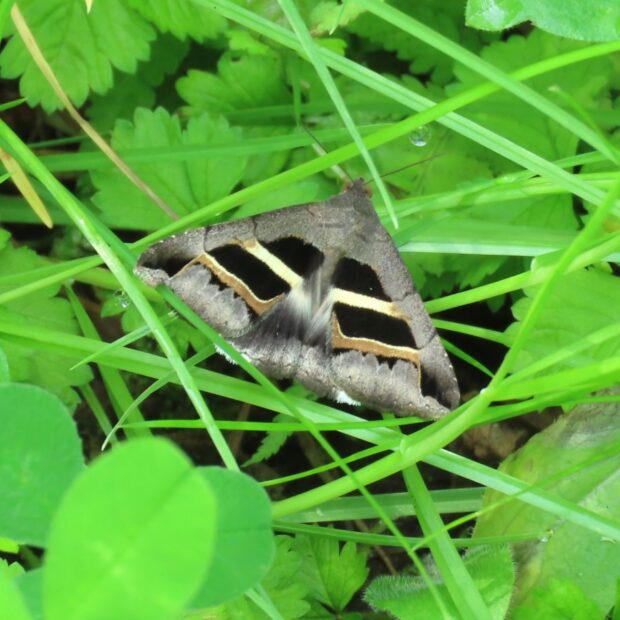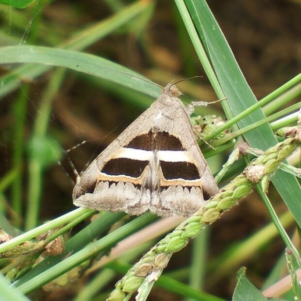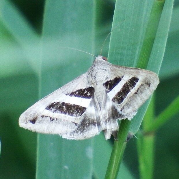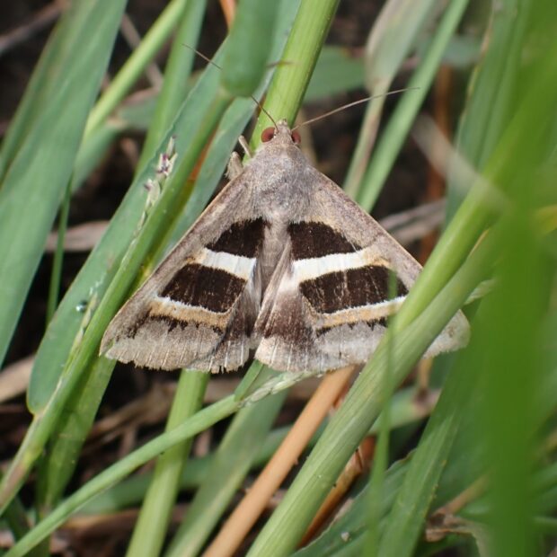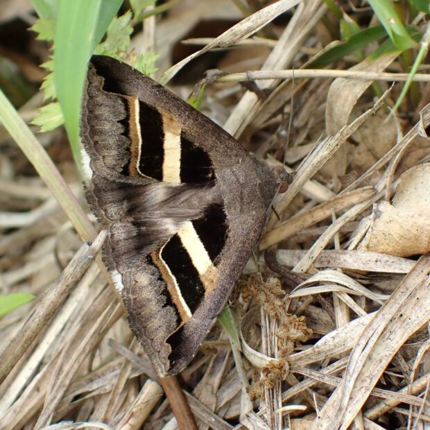 ヤガ科シタバガの仲間。 前ばねの黒と白の帯が特徴的。 後ばねには白いラインがあります。 南方系のガですが、 分布が北上し増加しています。