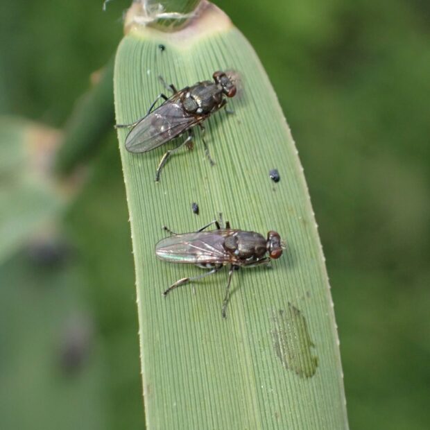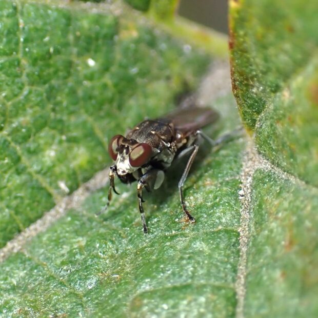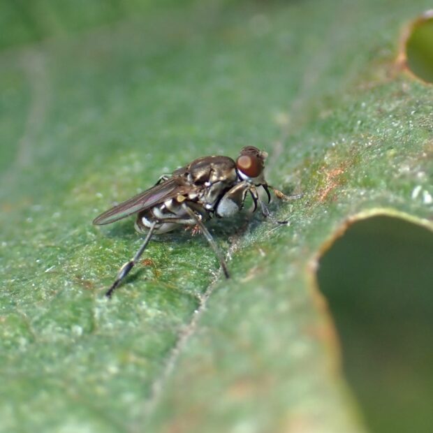 ミギワバエの仲間。 個体数は多く、 湿地や水際で普通に見られます。 前あしが、 カマキリのように鎌状になっておりトゲがあります。 ジャンプして獲物に飛びかかり、 前あしで獲物を取り押さえます。 鎌状の前あしを大きく広げて、 威嚇し合う姿をよく見かけます。