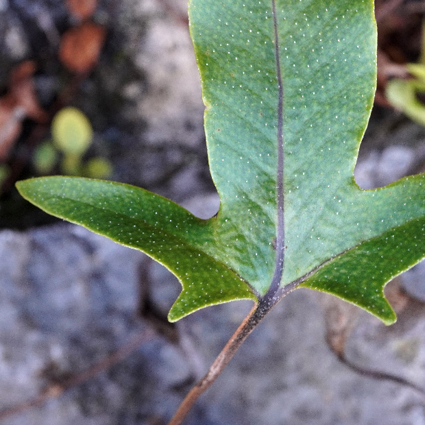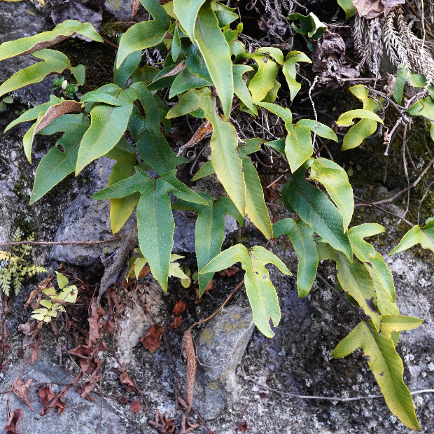 岩場などに生える着生シダ。 葉は厚くて、 下部が3から5つに浅く切れ込み、 葉裏に星型の毛や胞子のう群をびっしりつけます。 水生植物のオモダカの葉に似た形をしていて、 これが名前の由来になりました。