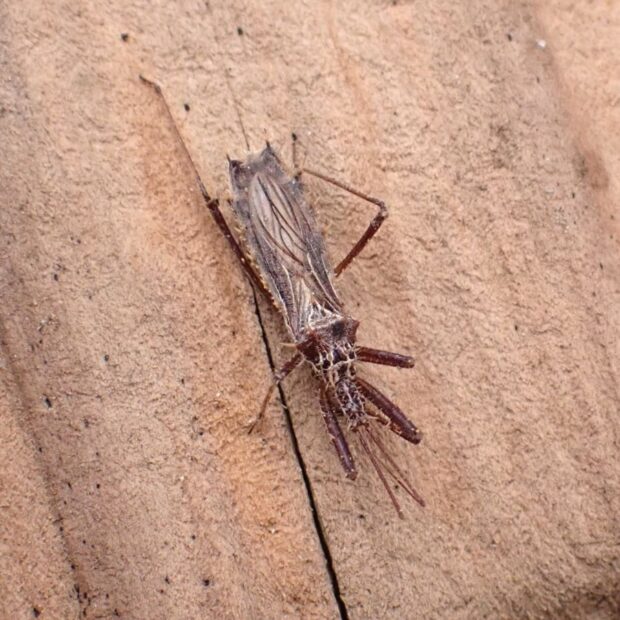 草地の地表で見られるサシガメ。 体は淡い褐色で、 名前の通り、 大小のトゲでおおわれています。
