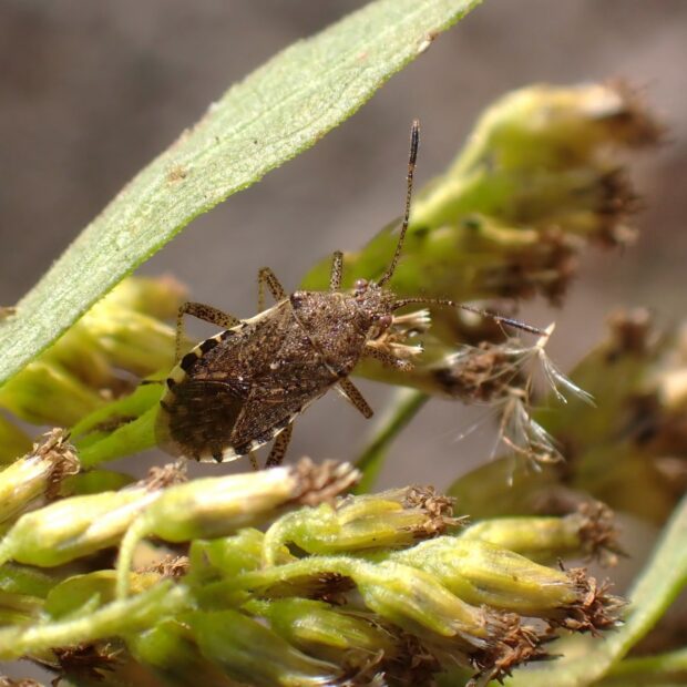 草はらで見られるヒメヘリカメムシの仲間。 体は褐色で、 名前のとおり、 細かな毛におおわれています。 ヒメヘリカメムシの仲間は似ているので識別には注意が必要。