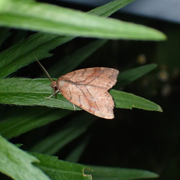 コブガ科リンガの仲間。 茶褐色の前ばねに、 段違いにずれた横線があります。 はねの色は、 赤っぽいものから茶色っぽいものまでいろいろ見られます。