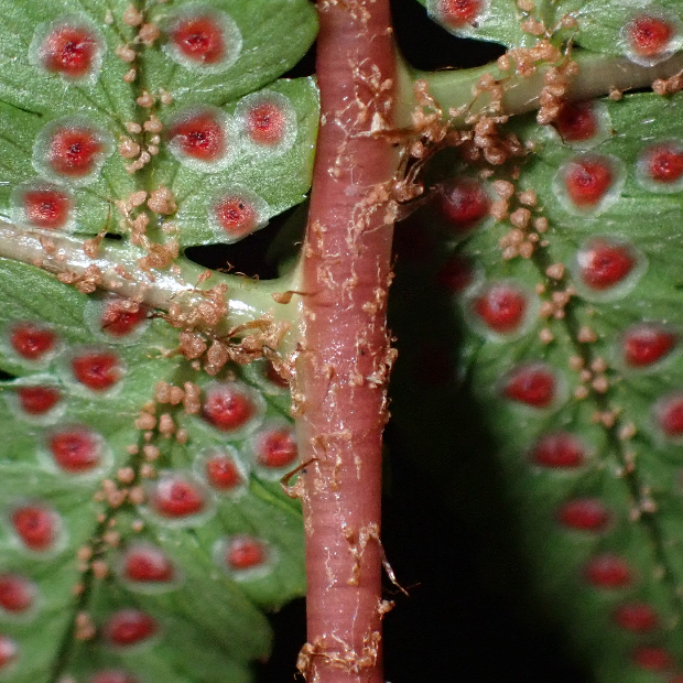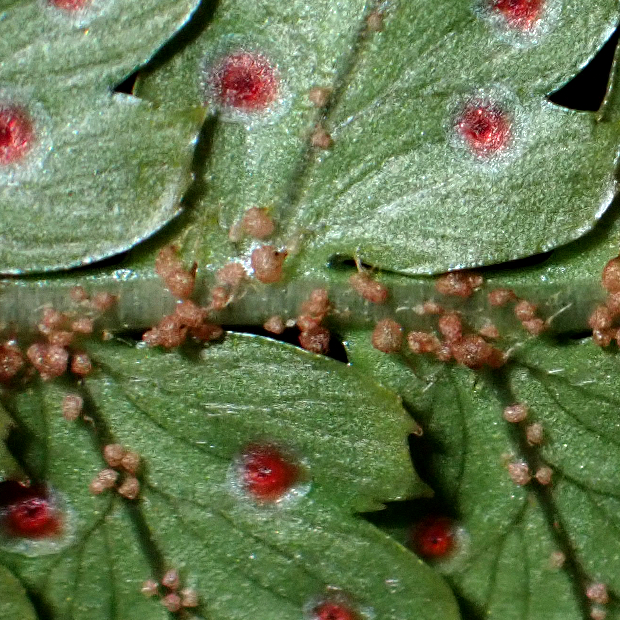 胞子のう群は円形で、 フチと脈の中間につくことが多いが、 フチ寄りや脈寄りのこともある。