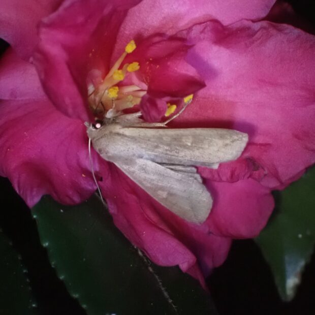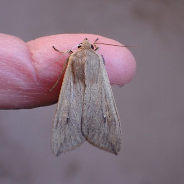 ヤガ科ヨトウガの仲間。 イネ科植物を食べる灰褐色のガ。 中国から日本に飛来した成虫の産卵によって大発生が起きることがあります。 幼虫の密度により、 体色や行動が変化することが知られています。