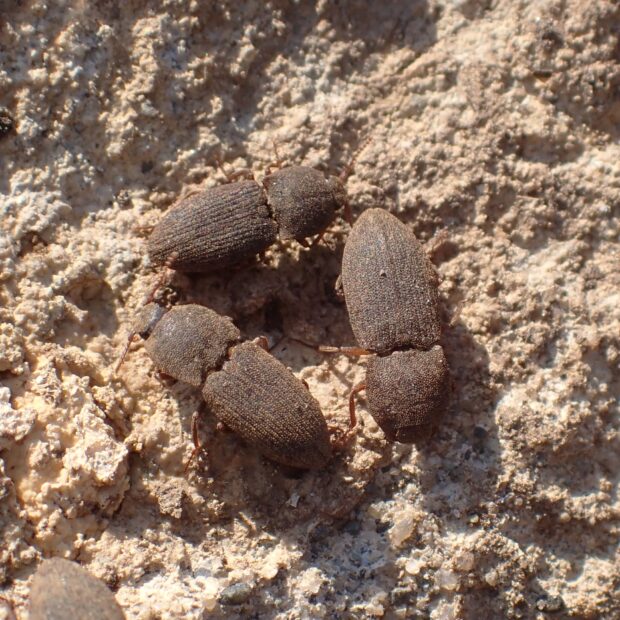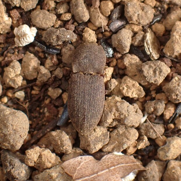 コメツキムシの仲間。 小型。 河原や草地の石の下で、 普通に見られます。 数頭~数十頭が集団でいるときがあります。 コガタヒメサビキコリ(前胸が盛り上がり、 後方の幅が平行)など似ている種類がおり、 識別には注意が必要。