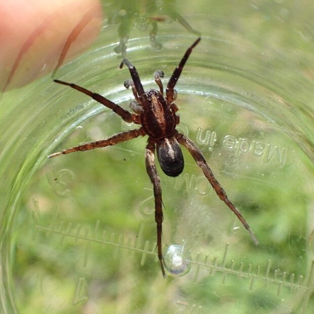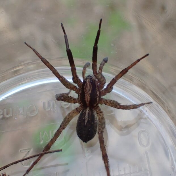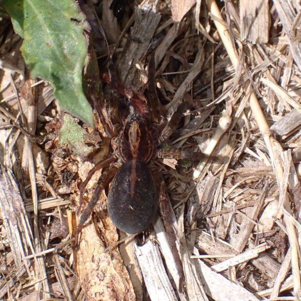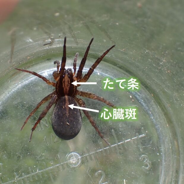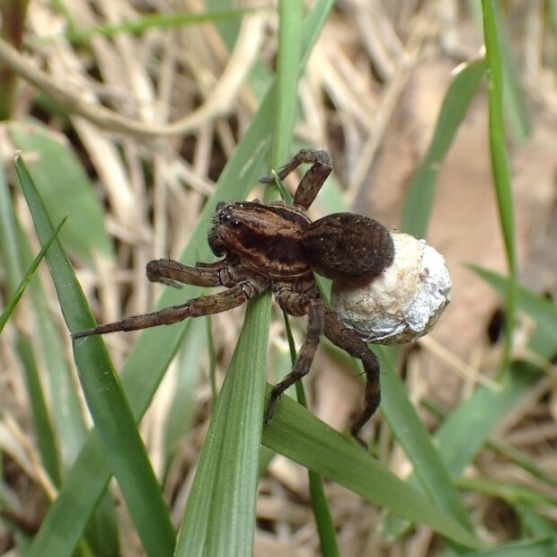 コモリグモの仲間。 オスメスともに体は茶褐色。 草の間、 地表などを歩き回って獲物を探します。 産卵のときは、 地中に簡単な穴を掘って袋状の住居をつくり、 卵のうを守ります。