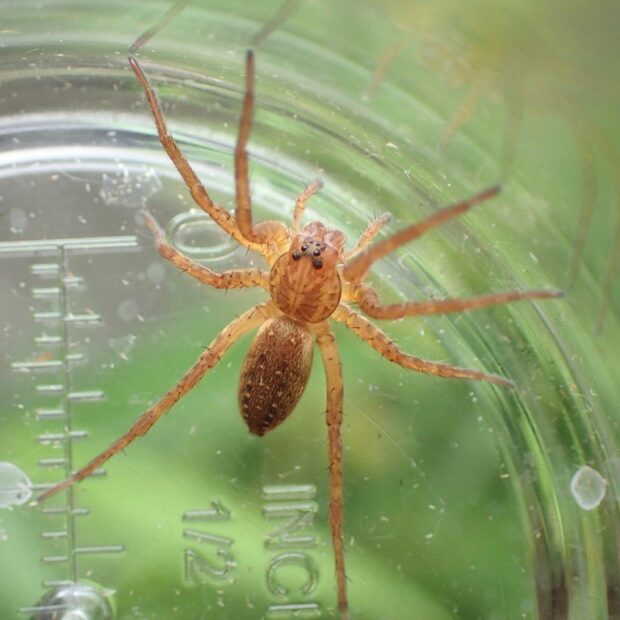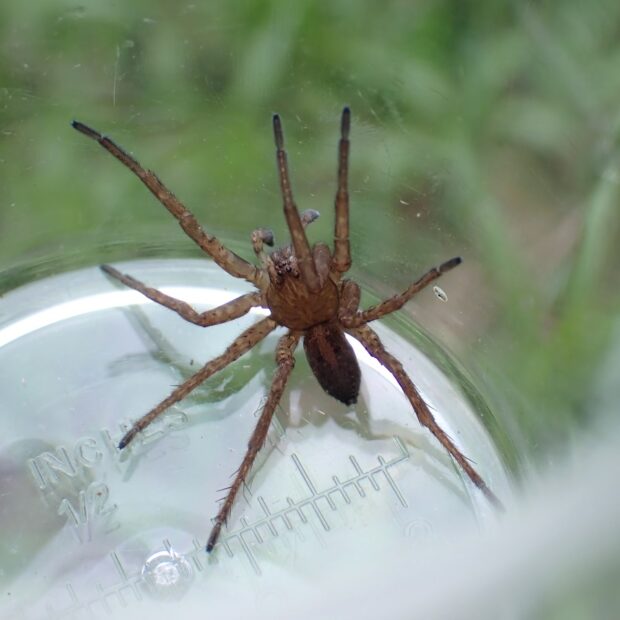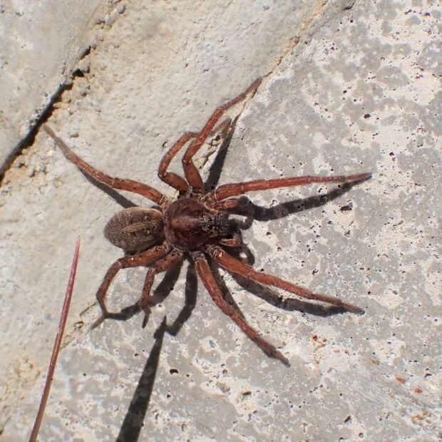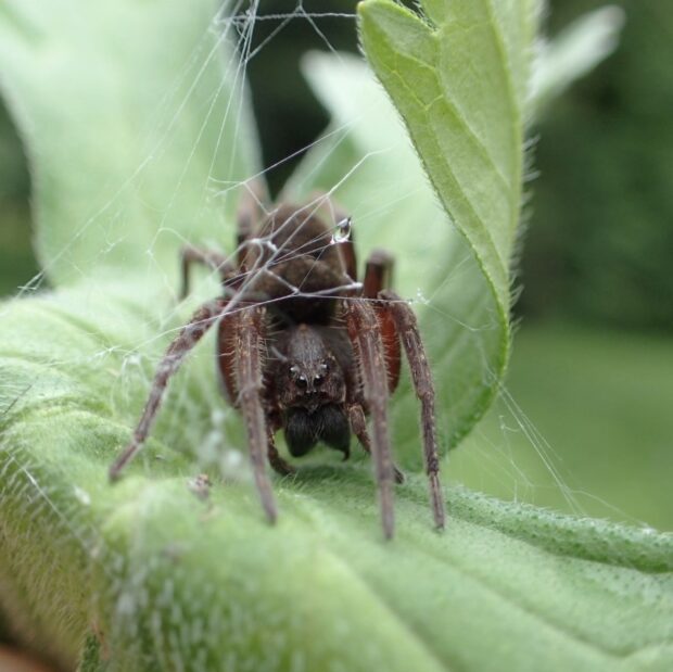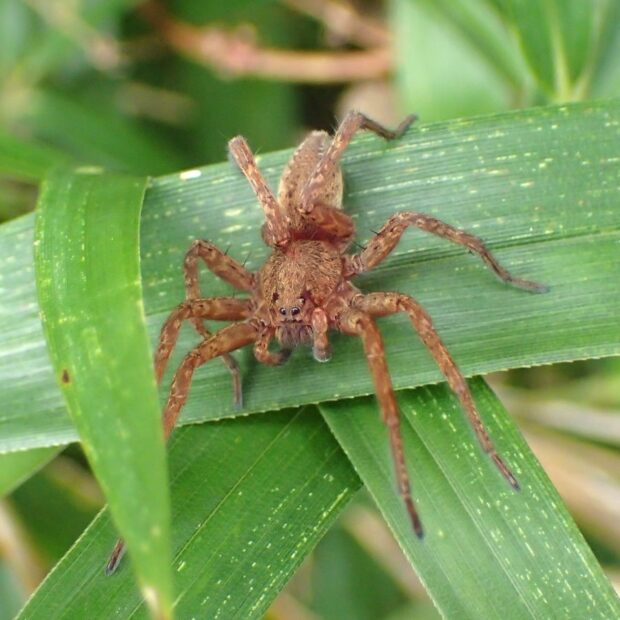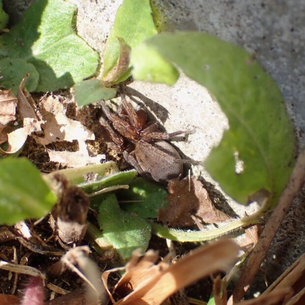 大型のコモリグモ。 オスもメスも濃い茶褐色。 草地や河原を歩き回り獲物を探す徘徊性のクモ。 秋に成体になり、 産卵期には地面に穴を掘り、 卵のうをつけたまま潜んでいます。
