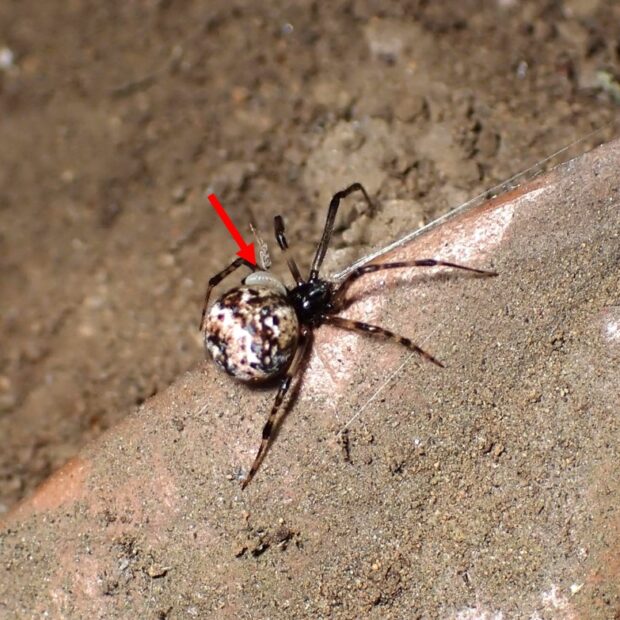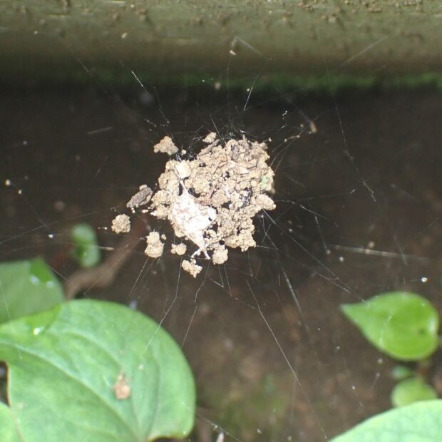 ヒメグモの仲間。 平地~山地まで広く生息し、 石垣やコンクリート壁などで見られます。 不規則網を張り、 土、 砂、 食べかすなどをつけたつりがね状の住居を作り、 その中に潜んでいます。 ツリガネヒメグモに似ていますが、 本種は大きいです。