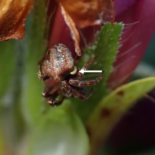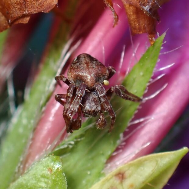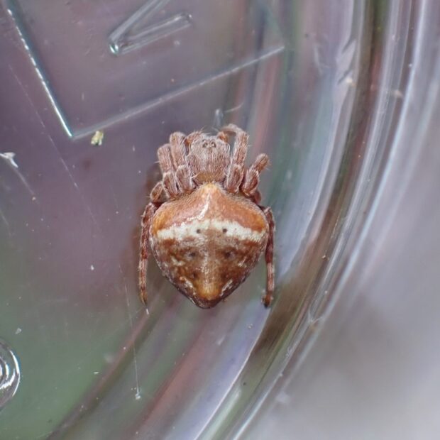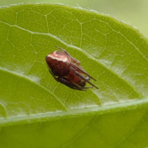 コガネグモ科の仲間。 お尻がややとがったあずき色の小さなオニグモ。 平地~山地まで広く生息し、 草はら、 樹林地など様々な環境で見られます。 垂直または斜めに円網を張り、 網の端の枝や葉裏に潜んでいます。 名前はクモ学者の緒方清人に因みます。 南方系のクモですが北上中。