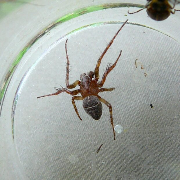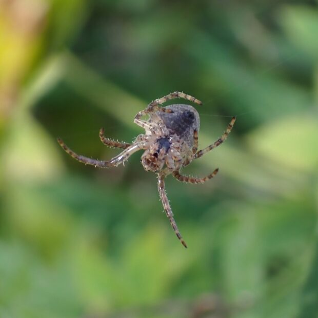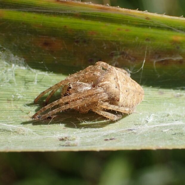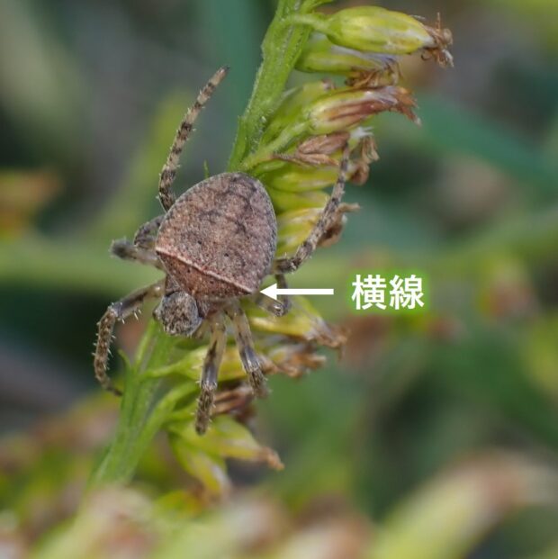 早春に成熟するコガネグモ科の仲間。 水田の周辺や草地などで見られます。 腹部の上方にある横線が目立ちますが、 はっきりしない個体もいます。 オニグモの仲間としては珍しく、 水平に円網を張ります。 キザハシとは階段を意味し、 腹部には段がついています。