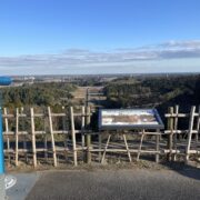 公園の西側は、 標高60mから90mの下総台地に連なり、 東側は九十九里平野と下総台地を分ける高低差約50mの崖地(海蝕崖)に接しています。 展望台(海抜101m)からは、 九十九里平野と太平洋の水平線が一望できます。