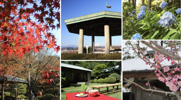 大磯城山公園は、 旧三井財閥別荘跡地と旧吉田茂邸跡地を整備した神奈川県立都市公園です。 旧三井別邸地区には、 シイやカシ、 ケヤキなどの木々が葉を広げる豊かな自然の中に、 日本情緒あふれる茶室や大磯町郷土資料館などが点在し、 また国道を隔てた旧吉田茂邸地区には、 吉田茂が住まいした往時の邸宅を再建した建物と、 モダニズムを加えた和風庭園の先駆けである庭園があります。