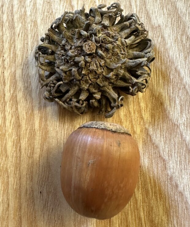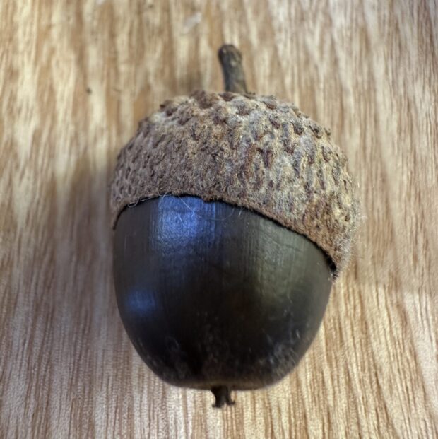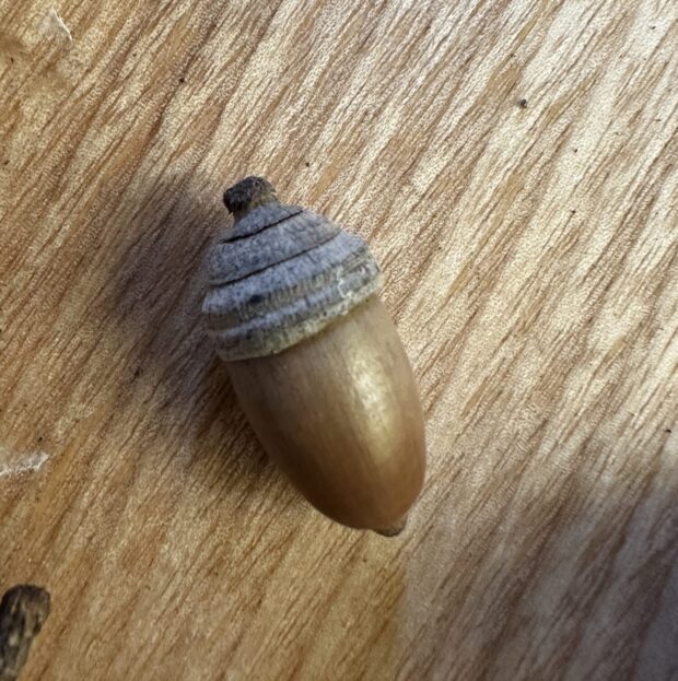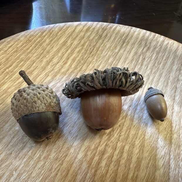 答え(こたえ)は手編み(てあみ)帽子(ぼうし)のどんぐりです。どんぐりを見分ける(みわける)ときは殻(から)斗(と)と呼ば(よば)れるどんぐりの帽子(ぼうし)をよく見(み)ます。2番(ばん)の毛(け)先(さき)を遊ば(あそば)せているのはクヌギ、シマシマ帽子(ぼうし)はシラカシです。