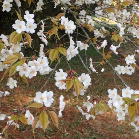 ヤマザクラの花(はな)は、ソメイヨシノよりも少し(すこし)遅く(おそく)、新しい(あたらしい)葉(は)が花(はな)と同時に(どうじに)出(で)てくるのが特徴(とくちょう)なんだ。