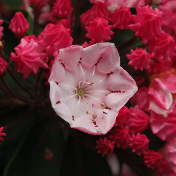 カルミアの花(はな)には、虫(むし)が来る(くる)と雄しべ(おしべ)が動い(うごい)て背中(せなか)に花粉(かふん)をつける仕掛け(しかけ)があります。