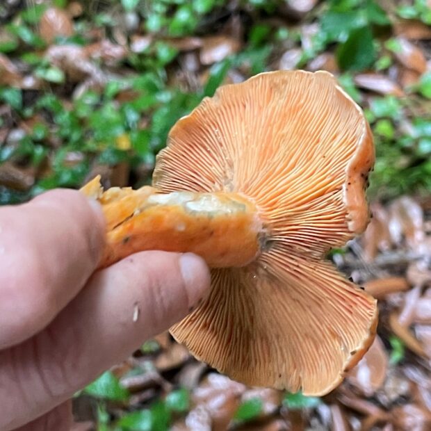 アカハツはアカマツやクロマツなどの下(した)に生え(はえ)ます。 ヒダ(傘(かさ)の裏側(うらがわ)のすじの入っ(はいっ)た部分(ぶぶん))は、傷つける(きずつける)とオレンジ色(しょく)の汁(しる)が出(で)てきて、時間(じかん)がたつとゆっくり青く(あおく)変色(へんしょく)します。