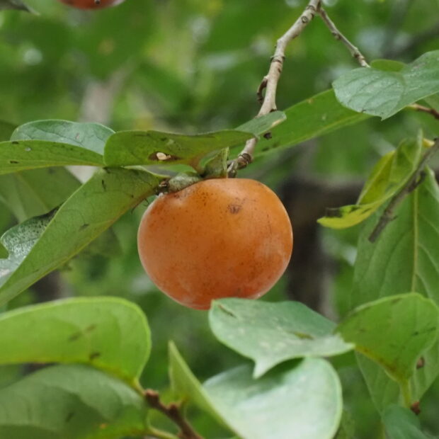 カキノキの実は(じつは)(あき)赤く(あかく)なります。食料(しょくりょう)乏しい(とぼしい)(ふゆ)にむけて(ひと)動物(どうぶつ)もこの実は(じつは)貴重(きちょう)でした。カキが実る(みのる)風景(ふうけい)もなかなか()られなくなっているのかもしれません。