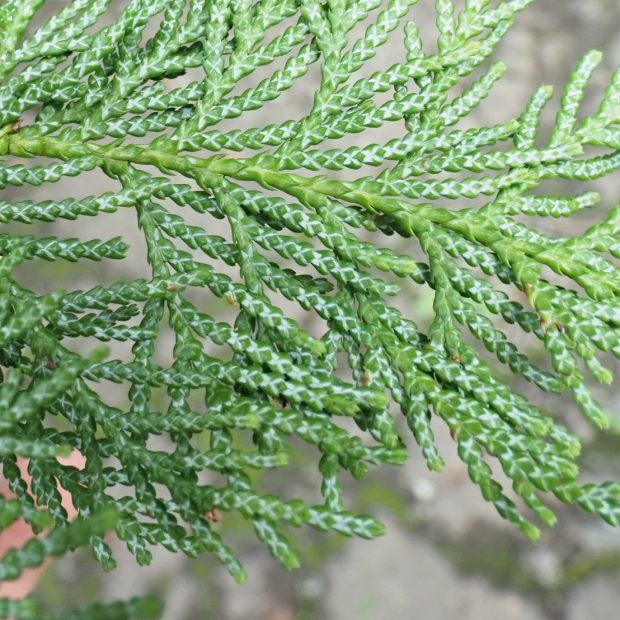 サワラを裏返る(うらがえる)とXの文字(もじ)か蝶(ちょう)の形(かたち)に見える(みえる)模様(もよう)があります。どんな形(かたち)に見える(みえる)か、ぜひ葉(は)を裏返し(うらがえし)て見(み)てみてください。