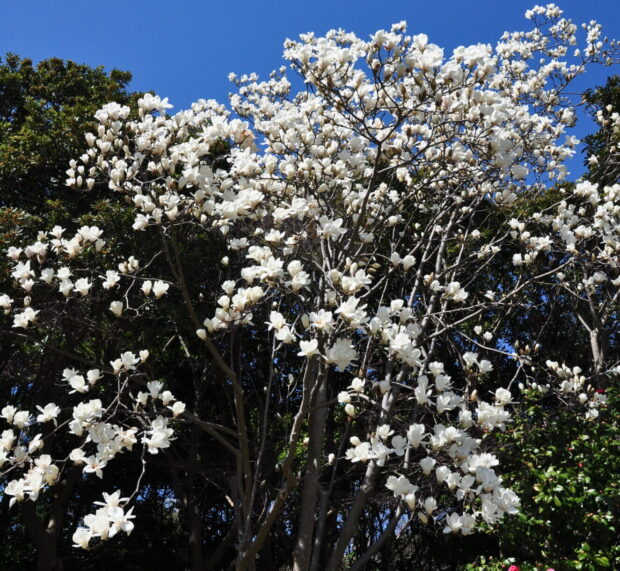 ハクモクレンは元々(もともと)中国(ちゅうごく)生え(はえ)ていた()です。早春(そうしゅん)咲く(さく)(はな)美し(うつくし)さが世界(せかい)植え(うえ)られるようになりました。