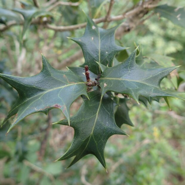 ヒイラギの葉(は)のギザギザが悪魔(あくま)や鬼(おに)を追い払う(おいはらう)と考え(かんがえ)られたからです。 節分(せつぶん)には葉(は)のついたヒイラギの葉(は)に焼い(やい)たイワシの頭(あたま)をさして戸口(とぐち)に飾る(かざる)風習(ふうしゅう)があります。