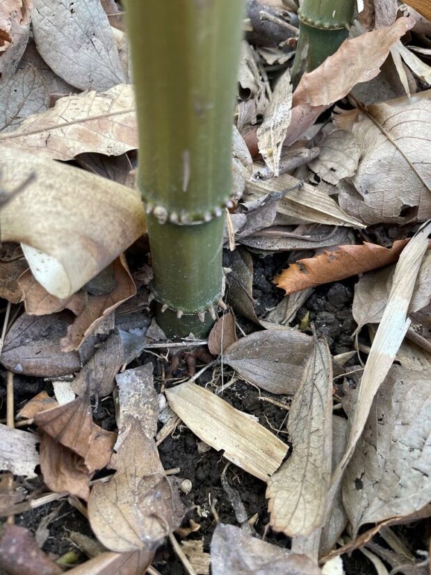 根元(ねもと)の節(ふし)の間(ま)が短く(みじかく)なり、枝(えだ)の出る(でる)反対(はんたい)側(がわ)がふくらんで太く(ふとく)なるのでラッキョウを縦(たて)につないだように見え(みえ)ます。