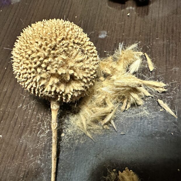 種(たね)でぎっしり固め(かため)たような実(み)で、乾燥(かんそう)してほぐれると種(たね)は毛(け)をパラシュートのように広げ(ひろげ)て風(かぜ)にのります。普通(ふつう)、この実(み)を動物(どうぶつ)は食べ(たべ)ず、風(かぜ)を頼り(たより)に移動(いどう)します。