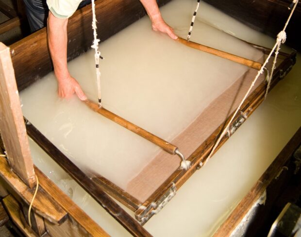 ノリウツギの枝(えだ)から取れる(とれる)粘液(ねんえき)は紙(かみ)を作る(つくる)ときに繊維(せんい)をまとめる糊(のり)として使わ(つかわ)れました。そこから名前(なまえ)に「ノリ」とつきました。 写真(しゃしん):トキ(PhotoLibrary)