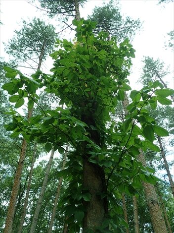 1番(ばん)がツタウルシです。3枚(まい)セットになった葉(は)を覚え(おぼえ)てください。2番(ばん)はツルアジサイ、3番(ばん)はイワガラミです。3つとも一緒(いっしょ)にはえていることも多く(おおく)、写真(しゃしん)のように木(き)に絡む(からむ)ので間違え(まちがえ)やすいです。ツルアジサイとイワガラミはツル植物(しょくぶつ)にしては成長(せいちょう)が遅く(おそく)、絡ん(からん)だ木(き)を覆う(おおう)ことはほぼありません。