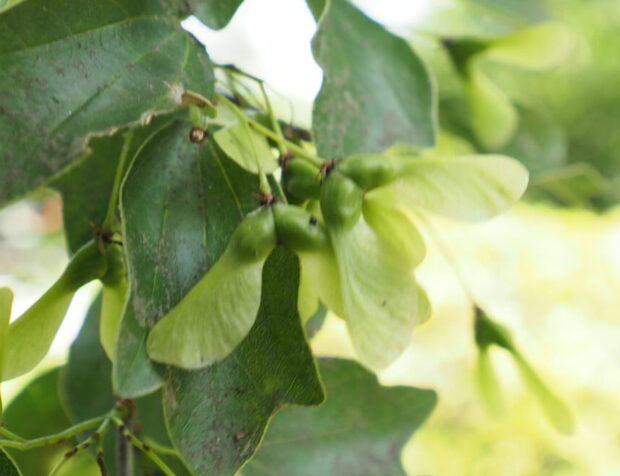 タイワントウカエデの種(たね)は2個(こ)くっついた形(かたち)で実っ(みのっ)ています。それを半分(はんぶん)に割っ(わっ)て投げる(なげる)と、クルクルと回っ(まわっ)てゆっくり落ち(おち)ていきます。地面(じめん)に落ちる(おちる)時間(じかん)が長い(ながい)ので、より遠く(とおく)に種(たね)は飛ん(とん)でいきます。