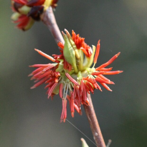 フサザクラの花(はな)の赤く(あかく)見える(みえる)部分(ぶぶん)は実は(じつは)雄しべ(おしべ)です。花びら(はなびら)はありません。サクラと名前(なまえ)につきますがサクラとは全然(ぜんぜん)違う(ちがう)仲間(なかま)です。