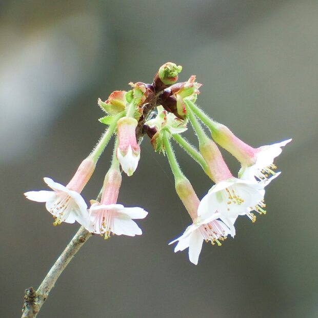 チョウジザクラの花(はな)は、花びら(はなびら)が小さめ(ちいさめ)で水平(すいへい)に開き(ひらき)ます。横(よこ)から見る(みる)と丁(ひのと)の字(じ)に見える(みえる)ので名前(なまえ)に丁字(ていじ)とつきました。