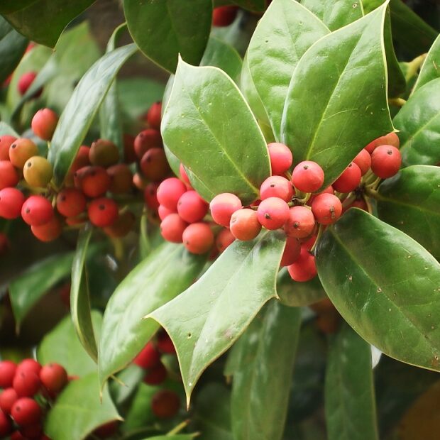 シナヒイラギの実は(じつは)冬(ふゆ)に赤く(あかく)熟し(じゅくし)ます。夏(なつ)に黒い(くろい)実(み)がなるのは、モクセイ科(か)のヒイラギです。