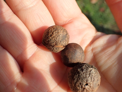 正解(せいかい)は1番(ばん)。2番(ばん)はマメガキ、3番(ばん)はイチョウの銀杏(いちょう)です。イチョウとナギは雰囲気(ふんいき)が似(に)ていますが、銀杏(いちょう)の匂い(におい)は強烈(きょうれつ)です。写真(しゃしん)は古い(ふるい)ナギの実(み)