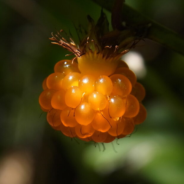 モミジイチゴの実は(じつは)、黄色(きいろ)〜明るい(あかるい)だいだい色(しょく)です。森(もり)の中(なか)や公園(こうえん)などであまり目立た(めだた)ないかもしれませんが、見つけ(みつけ)てみてくださいね!
