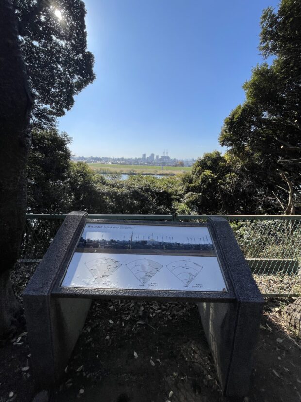里見(さとみ)公園(こうえん)は下総台地(しもうさだいち)の西端(せいたん)、江戸川(えどがわ)に面し(めんし)た高台(たかだい)に位置(いち)しています。 展望(てんぼう)案内(あんない)板(ばん)のある場所(ばしょ)からは、眼下(がんか)を流れる(ながれる)江戸川(えどがわ)と、その向こう(むこう)に広がる(ひろがる)東京(とうきょう)都心(としん)の景色(けしき)を一望(いちぼう)することができます。