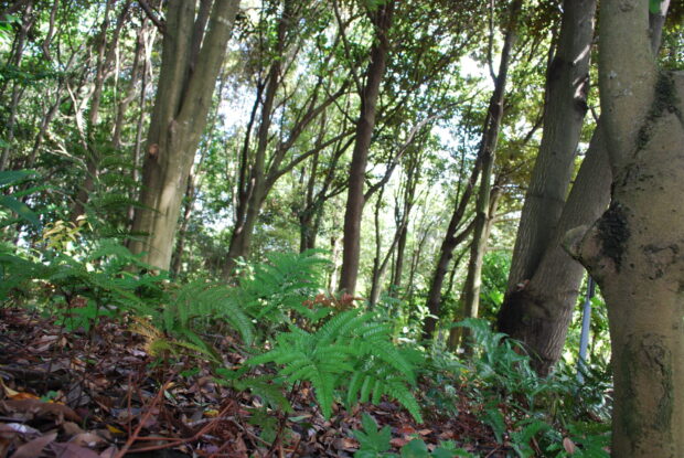 葉に光沢がある照葉樹林で、 海岸付近のヤブツバキ-スダジイ-タブノキ林や内陸のアラカシ-シラカシ-アカガシ林があります。 前者の林床にはホソバカナワラビ、 イノデ、 マンリョウなど、 後者にはアイアスカイノデ、 キンラン、 ササバギンランなどがみられます。 沖縄から東北地方南部まで広がる林です。
