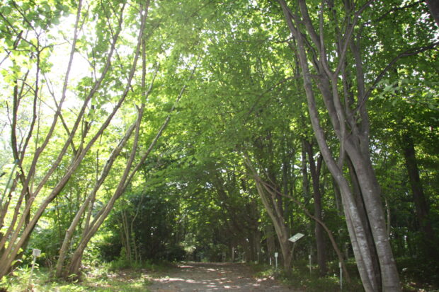 中部日本の800~1600mの山地に見られる森林で、 ブナ帯と呼ばれます。 ブナ、 イヌブナ、 ミズナラ、 カエデ類の落葉樹からなり、 林床が明るく低木層のツツジ類や草本層の種類が豊かです。 また奥に向かって流れる小川では、 レンゲショウマなど湿潤で冷涼な環境を好む日本固有の草本類が見られます。