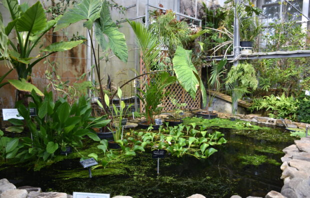水生植物のさまざまな水環境への適応が見られます。 熱帯水生植物室 : 亜熱帯~熱帯の河川、 湖沼、 湿地の植物/マングローブ室 : マングローブ植物と海岸隆起サンゴ礁上の植物/アクアスロープ : 水生植物の様々な受粉のしくみを展示。