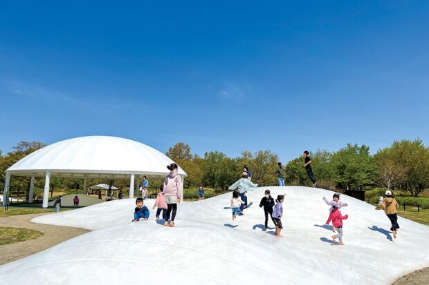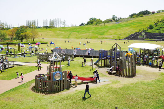 ローラーすべり台やターザンロープ、 スカイジムなど、 26種類の大型アスレチック遊具や芝ソリゲレンデ、 「ふわふわドーム」があります。