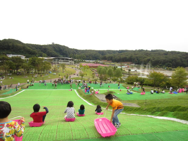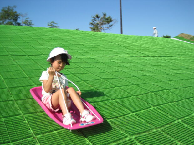 長さ40mと20mの長短2コースあるソリゲレンデで、 芝の上を滑る爽快感をご体験下さい。 (対象 : 中学生以下)ソリは無料貸出がございます。