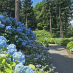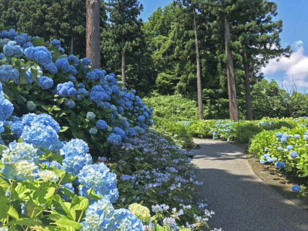 フォリーの丘への階段または暖の館から彩の小径を通ってアジサイ園を周遊できます。